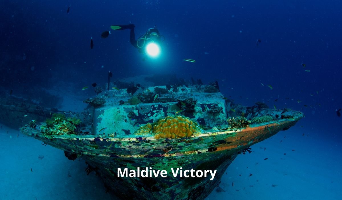 Maldive Victory – Naufrágio icônico para mergulhadores, onde é possível explorar uma embarcação envolta em corais e vida marinha exótica.
