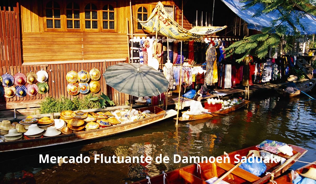 Mercado Flutuante de Damnoen Saduak – Uma experiência única de compras em barcos, onde você pode degustar comidas locais e comprar artesanatos típicos em meio a paisagens pitorescas.