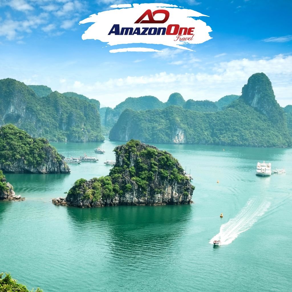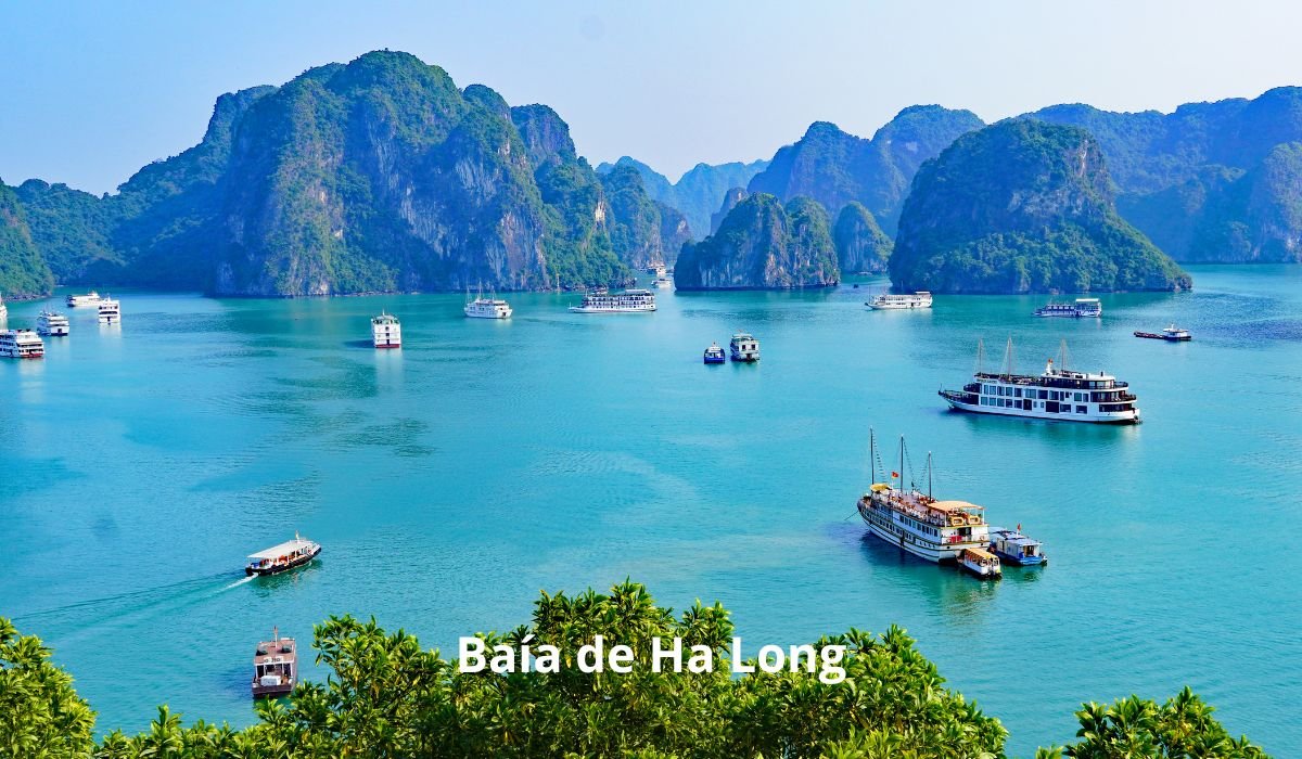Baía de Ha Long – Um Patrimônio Mundial da UNESCO, famoso por suas águas esverdeadas e milhares de ilhas cobertas por vegetação exuberante.