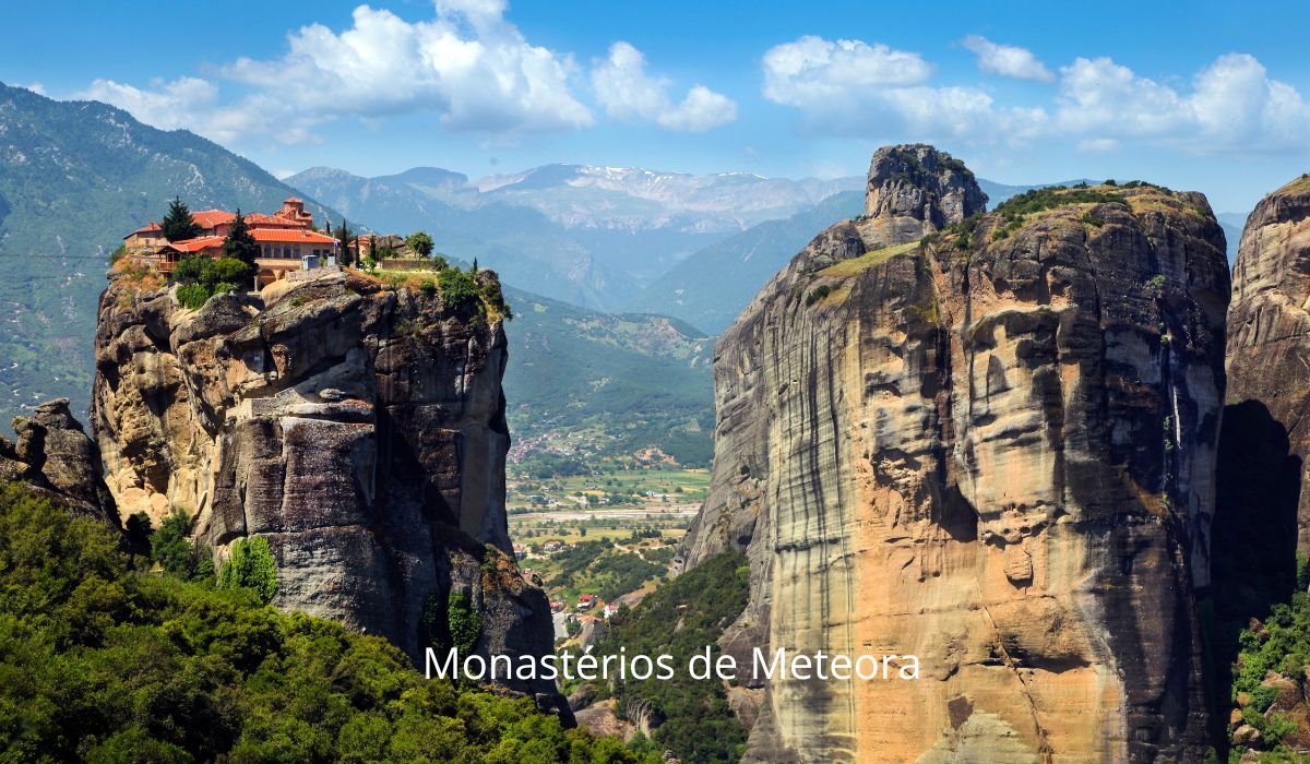 Monastérios de Meteora – Patrimônio Mundial da UNESCO, esses impressionantes monastérios são construídos sobre formações rochosas verticais, oferecendo vistas de tirar o fôlego.
